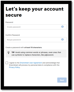 - Click the link in the email to set your password and agree to Smartsheet’s User Agreement and Privacy Policy.